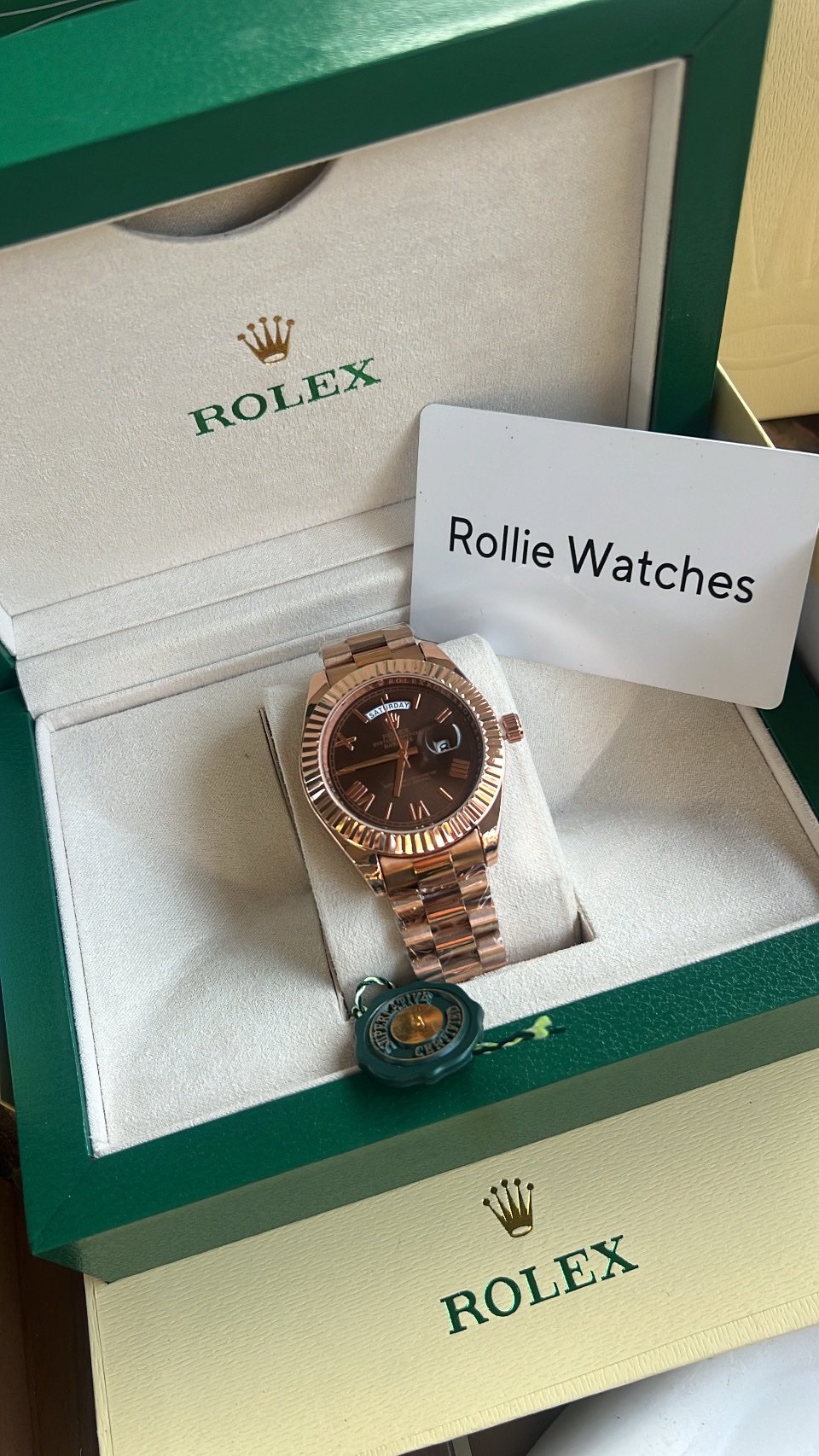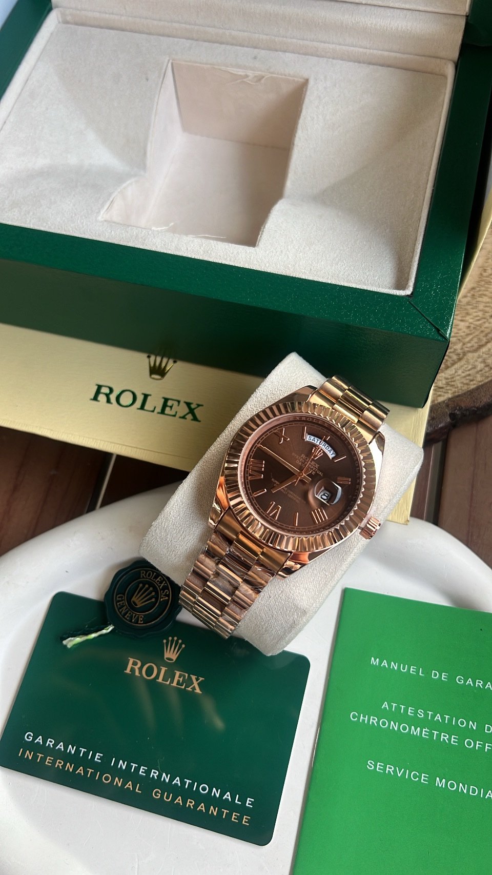 Elevate your style with our Rolex Perpetual Day-Day Watch, crafted to mirror the original in every detail same design, weight, and Quartz movement. Built with premium materials for a luxury feel that lasts.